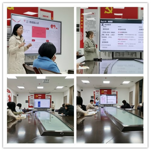 第一组倪竞老师的《医学心理学》课程以学生为中心设计课堂,通过设计学生参加心理测试等方式激发学习兴趣,增强参与感。董欣老师的《护理教育学》结合教育学、健康教育理论、护理学理论设计教学,推动经验型向实践型转变,提升教学设计的理论支撑。叶碧云老师的《护理伦理学》通过案例,强化护士职业素养,助力构建和谐医患关系,保障患者权益和提升服务质量;以推动护士从“技术执行者”向“伦理思考者”的角色转变,提升学生综合职业能力。还有廖晓春、余晓波、李缘媛三位老师分别从课程定位、教学目标、教学内容、教学方法、教学资源、课程特色、课程思政等部分进行说课,进一步优化教学设计和完善教学环节。