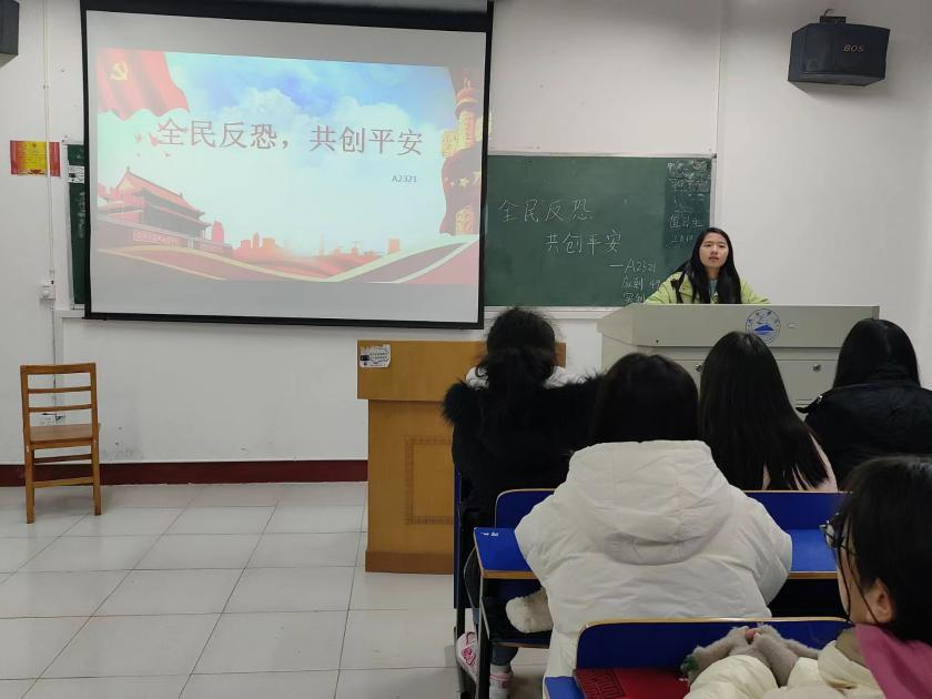 活动上,各班主讲人准备充分,结合PPT和实际例子,为同学讲解了什么是恐怖主义和恐怖活动。同时普及了常见恐怖袭击手段有哪些、发生恐怖事件时如何做到迅速撤离。活动上,为切实提高同学们反恐防范能力,通过学习《中华人民共和国反恐怖主义法》和了解学习反恐小常识进一步加强反恐怖主义工作,维护校园安全、公共安全和同学生命财产安全。在不知不觉中,将反恐意识渗透到校园生活的方方面面。