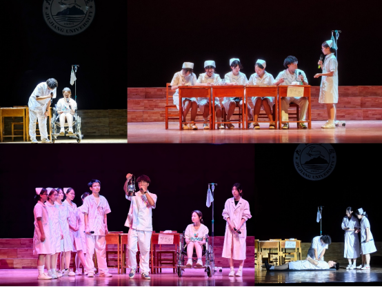比赛现场,太阳成集团tyc122cc带来的《提灯者》以护理工作者的职业视角为主线,生动展现了医护人员在高压工作、医患沟通中的内心成长历程。演员们通过细腻的肢体语言与情感表达,精准刻画了角色从目睹患者痛苦的共情、遭遇误解的无奈,到通过专业实践与自我调节实现心理突破的转变。舞台上,柔和的灯光与舒缓的音效交织,配合逼真的医疗场景布置,让观众沉浸式感受护理群体的坚韧内心与人文情怀。