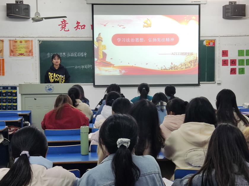 团日活动中,团支书带领同学们了解宪法知识,学习宪法意义,通过两段宪法宣传视频,把宪法相关知识更加形象具体生动地展现在了同学们眼前,使同学们学习贯彻法律面前人人平等的法治理念。宪法的意义在于它是中华人民共和国的根本大法,规定拥有最高法律效力。学好宪法,我们可以以更规范的方法维护自身的权益,保障自身生命安全,有利于促进广大学生养成遵纪守法、依法行事的好习惯,坚持习近平法治思想在全面依法治国中的指导地位,把宪法精神内植于心,内践于行,做宪法的忠实维护者,坚定执行者。