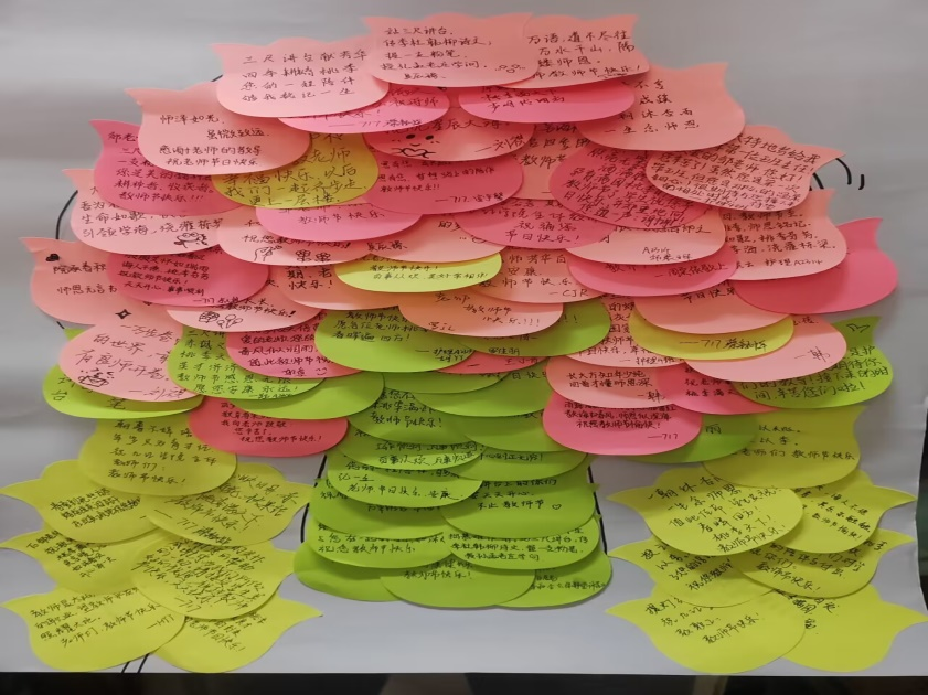 殷殷关怀遥寄语,温情话语暖人心。护理学子们拿起手中的纸笔,书写对老师辛勤教诲的感恩情怀。“希望老师身体健康,万事顺遂”、“春晖四方,桃李天下”、“老师,您辛苦了”朴素的话语深情真切,一张张便利贴仿佛涓涓细流,浇灌成了感谢师恩的参天大树。老师们倍感欣慰,纷纷表示,“谢谢同学们的祝福,我会继续在教育这片沃土上不忘初心,接续奋斗。”