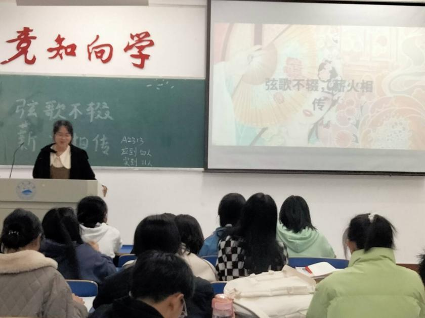 团课上,主讲人循序渐进,为大家讲述了非遗文化的历史发展以及保护非遗文化的意义。学习中,同学们深刻明白非遗是传统文化的一部分,是国家文化软实力的重要支柱之一。所谓“传而弘艺,统以在编,传统非遗文化梦;锦上添花,同中出彩,锦同名点玉林春。”了解古老技艺的前世今生,领略非遗文化的独特魅力,能够进一步坚定同学的文化自信,在历久弥新中孕育美好未来。最后,同学们纷纷表示上了一节意义非凡的非遗文化课。