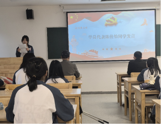会议第三项,学员代表陈佳怡同学上台发言。她结合先烈为党和国家事业英勇奋斗的事迹,讲述了当代青年肩负的责任与担当。陈佳怡同学表示,自己将以严格的标准要求自己,努力提升思想政治素养与综合能力,同时激励同学们用青春力量书写新时代华彩篇章,彰显青马学员的昂扬风貌。