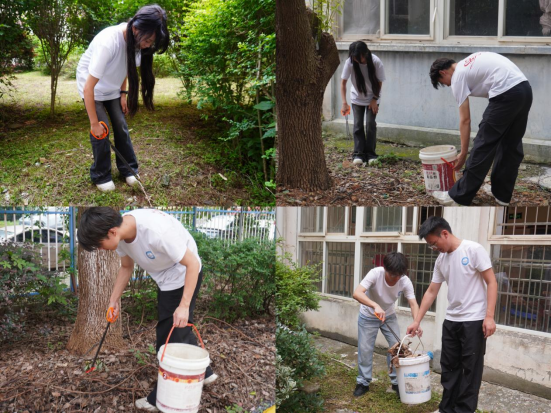 活动最后,队员们化身“环境守护者”,拿起扫帚、铁钳等工具,细致清扫庭院落叶与塑料。他们额头沁出细密的汗珠,却始终专注而认真。