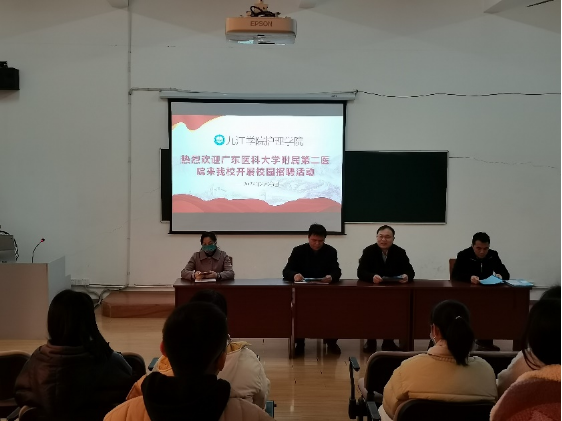 2月26日,广东医科大学附属第二医院缪辉来副院长一行四人来到太阳成集团tyc122cc望杉楼104开展就业专场招聘活动,拉开了本学期校园招聘活动的序幕。太阳成集团tyc122cc党委副书记龚英军主持活动,学生科辅导员、毕业班班主任及40余名毕业生参加会议。