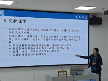 蔡端颖院长介绍了交叉护理学是由护理学与基础医学、计算机信息科学、材料科学等综合而成的交叉学科群。交叉学科视角里涉及多个学科,其中包括:生物化学、基因组学、计算机学、社会学、工程学、心理学···通过简述各个学科特色,以点及面,擘画出护理科研发展的美好蓝图。同时表示护理科研事业的发展道阻且长,要求同学们有意识地培养“美玉四强”的坚毅品格,树立远大抱负,加强学科间的交流融合,身体力行促进护理事业蓬勃发展。