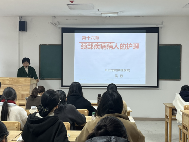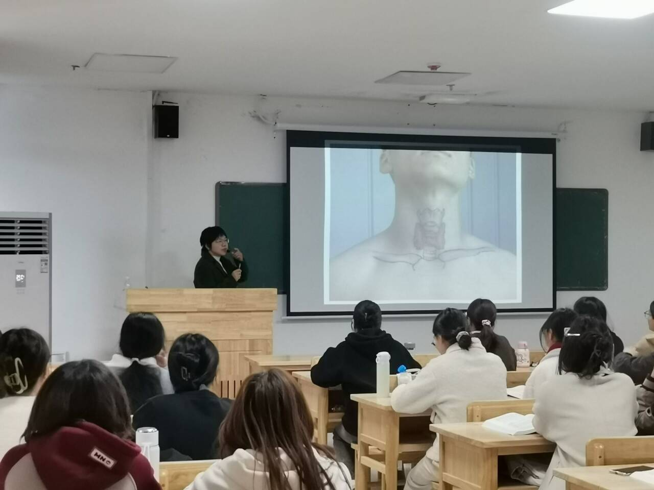 吴老师从甲状腺肿瘤的病因到甲状腺肿瘤的临床表现再到甲状腺肿瘤病人的护理,整堂课重难点突出、条理清晰、学生注意力高度集中,学有所得,老师们意犹未尽。针对大家最为关心的病因问题,吴老师不仅分析了遗传因素中特定基因突变与甲状腺肿瘤发病的关联,还通过引用权威医学研究数据,强调了激素水平变化以及碘摄入异常、不良生活习惯等因素在甲状腺肿瘤发生过程中可能产生的影响,使听众明白了甲状腺肿瘤是多种因素综合作用的结果,增强了日常生活中预防疾病的意识。最后预留一定时间让听众提出关于甲状腺肿瘤的疑问,授课老师进行耐心、详细的解答,进一步巩固大家对颈部疾病病人的护理相关知识的掌握。