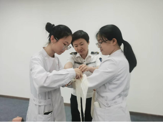 在实践操作环节、张莹科长分别就现场实战CPR、实战创伤急救(止血包扎)等进行了演示,并分组指导同学操作,按照实地操作的标准纠正同学的操作。