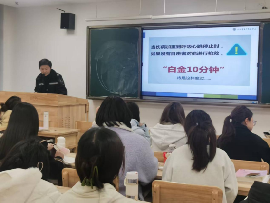 在理论授课环节,九江市医疗急救中心办公室主任柳菲老师和急救科科长张莹老师分别就EMSS系统的组成、院前急救基本原则、CPR前世今生、现场操作CPR的注意事项,以现场救援为模拟场景,分别在课堂上向同学们传授了宝贵的现场急救经验,讨论分析了一些精彩的现场急救案例,让同学“身临其境”感受现场急救的制度性、迫切性、原则性。