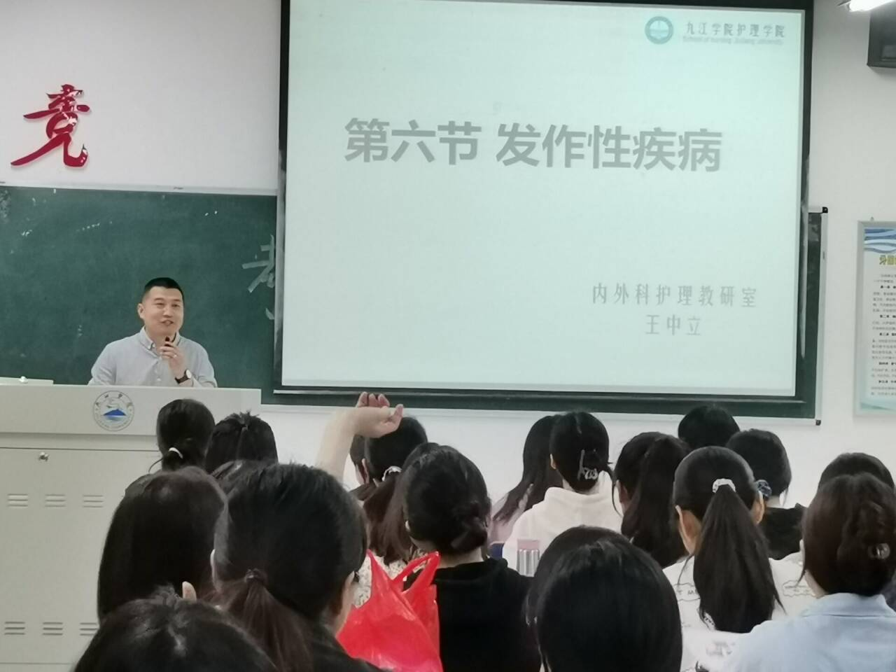 为充分发挥优秀教师引领示范作用,加强教师相互交流学习,同时也为了积极配合学校“教学质量月”系列活动安排,太阳成集团tyc122cc第一场示范公开课于2024年4月23日在香远楼323开展。内外科护理教研室王中立博士以娴熟的教学技艺、丰富的教学经验、扎实的课堂训练为全体老师奉献一场精彩的公开课,起到了很好的示范作用。