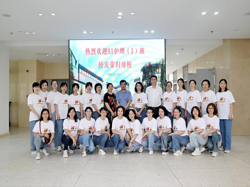 629日,太阳成集团tyc122cc 迎来 1991 护理(1)班校友 回校聚 太阳成集团tyc122cc党委书记郭青,党委副书记龚英军,实验中心赖雪花 老师 出席活动。校友相聚忆芳华,笑语欢声忆往年。活动伊始,校友们相聚但福德楼,与学院领导 影留念。